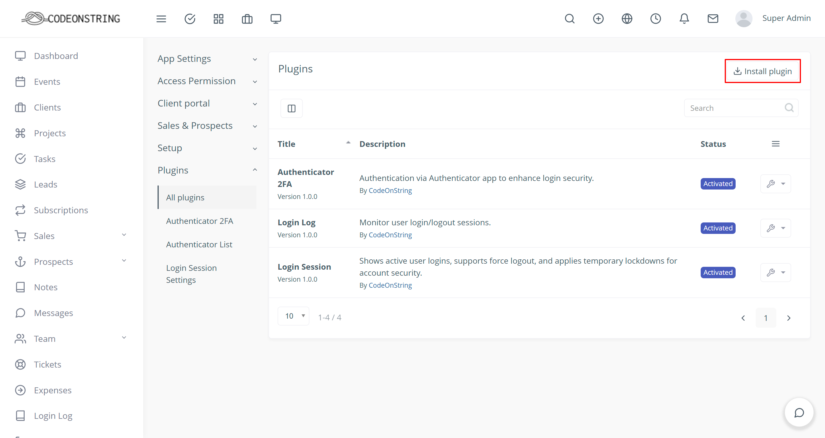 - Log in to the Rise CRM admin panel as an administrator and go to Settings → Plugins.